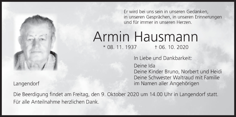 Hier finden Sie alle Traueranzeigen aus der Zeitung, die bisher für Armin Hausmann erschienen sind. Weitere Traueranzeigen, die in der Zeitung erscheinen, werden hier ebenfalls aufgelistet