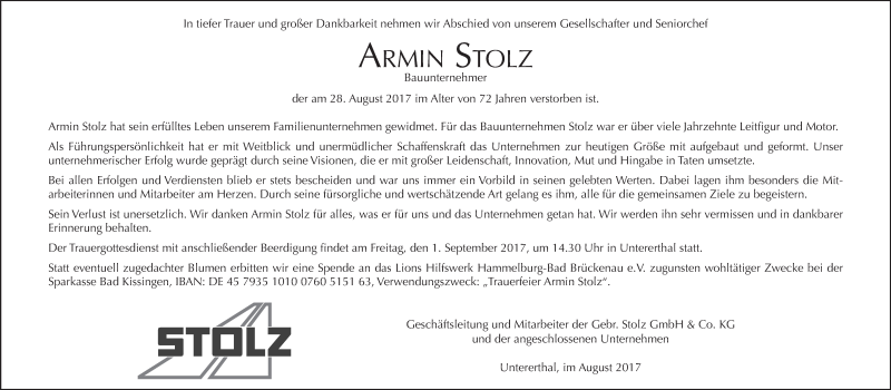 Hier finden Sie alle Traueranzeigen aus der Zeitung, die bisher für Armin Stolz erschienen sind. Weitere Traueranzeigen, die in der Zeitung erscheinen, werden hier ebenfalls aufgelistet