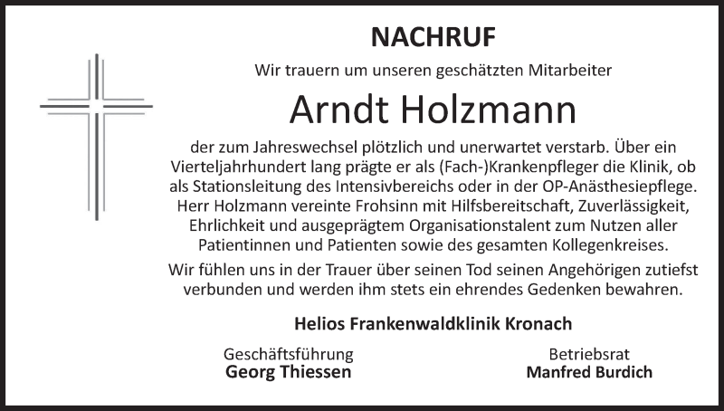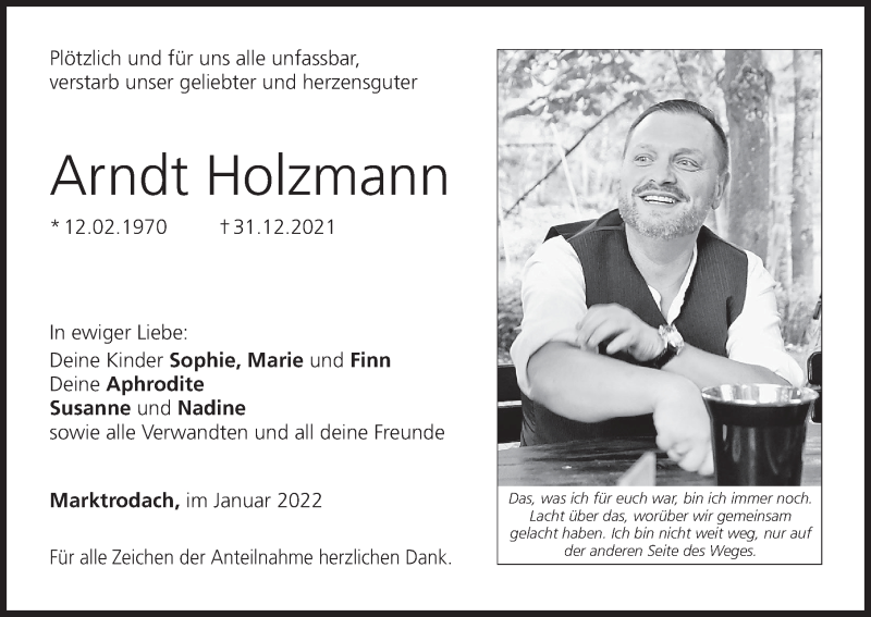 Hier finden Sie alle Traueranzeigen aus der Zeitung, die bisher für Arndt Holzmann erschienen sind. Weitere Traueranzeigen, die in der Zeitung erscheinen, werden hier ebenfalls aufgelistet