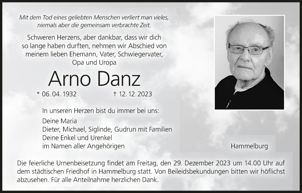 Hier finden Sie alle Traueranzeigen aus der Zeitung, die bisher für Arno Danz erschienen sind. Weitere Traueranzeigen, die in der Zeitung erscheinen, werden hier ebenfalls aufgelistet