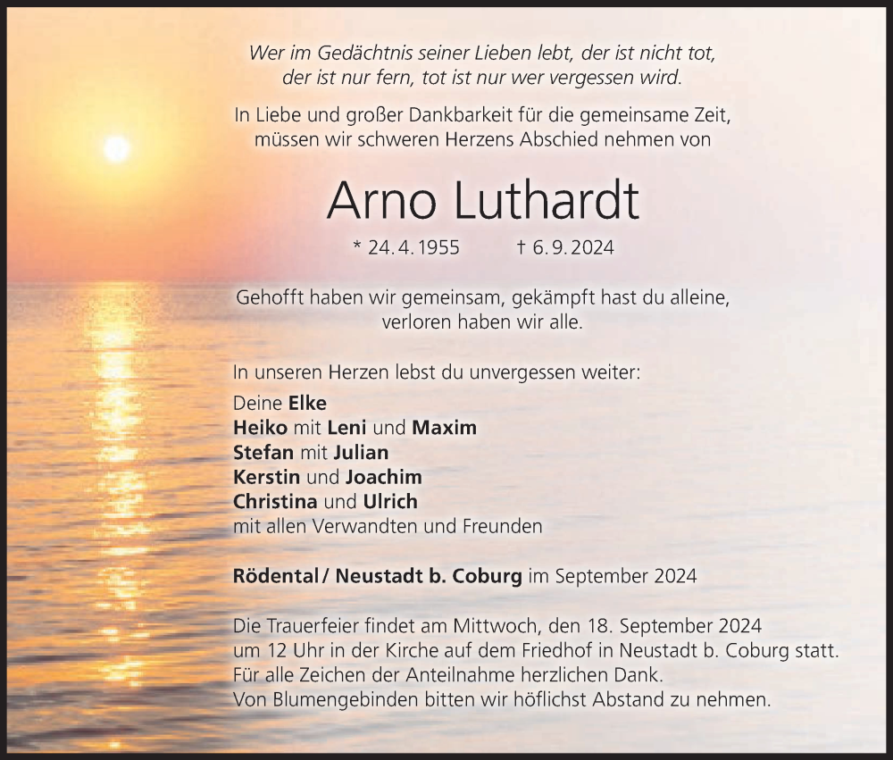 Hier finden Sie alle Traueranzeigen aus der Zeitung, die bisher für Arno Luthardt erschienen sind. Weitere Traueranzeigen, die in der Zeitung erscheinen, werden hier ebenfalls aufgelistet