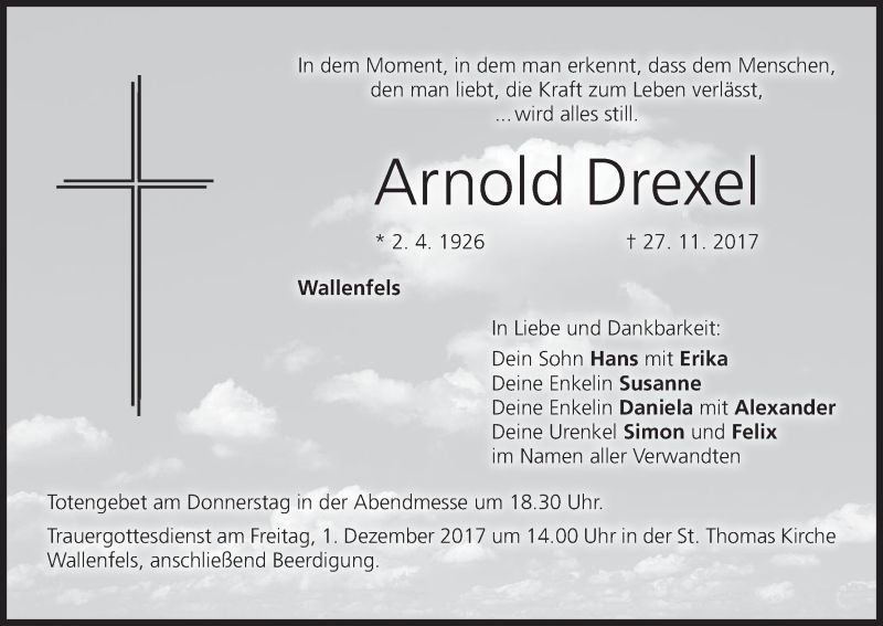 Hier finden Sie alle Traueranzeigen aus der Zeitung, die bisher für Arnold Drexel erschienen sind. Weitere Traueranzeigen, die in der Zeitung erscheinen, werden hier ebenfalls aufgelistet