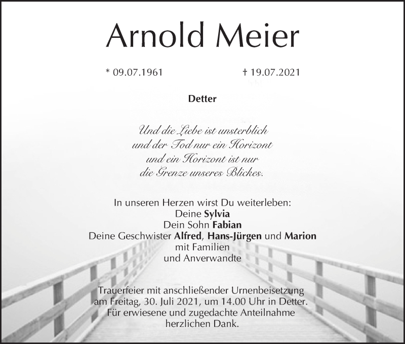 Hier finden Sie alle Traueranzeigen aus der Zeitung, die bisher für Arnold Meier erschienen sind. Weitere Traueranzeigen, die in der Zeitung erscheinen, werden hier ebenfalls aufgelistet
