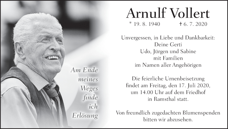 Hier finden Sie alle Traueranzeigen aus der Zeitung, die bisher für Arnulf Vollert erschienen sind. Weitere Traueranzeigen, die in der Zeitung erscheinen, werden hier ebenfalls aufgelistet