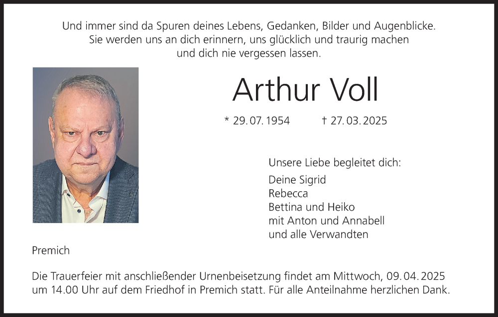 Hier finden Sie alle Traueranzeigen aus der Zeitung, die bisher für Arthur Voll erschienen sind. Weitere Traueranzeigen, die in der Zeitung erscheinen, werden hier ebenfalls aufgelistet