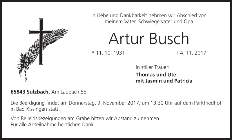 Hier finden Sie alle Traueranzeigen aus der Zeitung, die bisher für Artur Busch erschienen sind. Weitere Traueranzeigen, die in der Zeitung erscheinen, werden hier ebenfalls aufgelistet