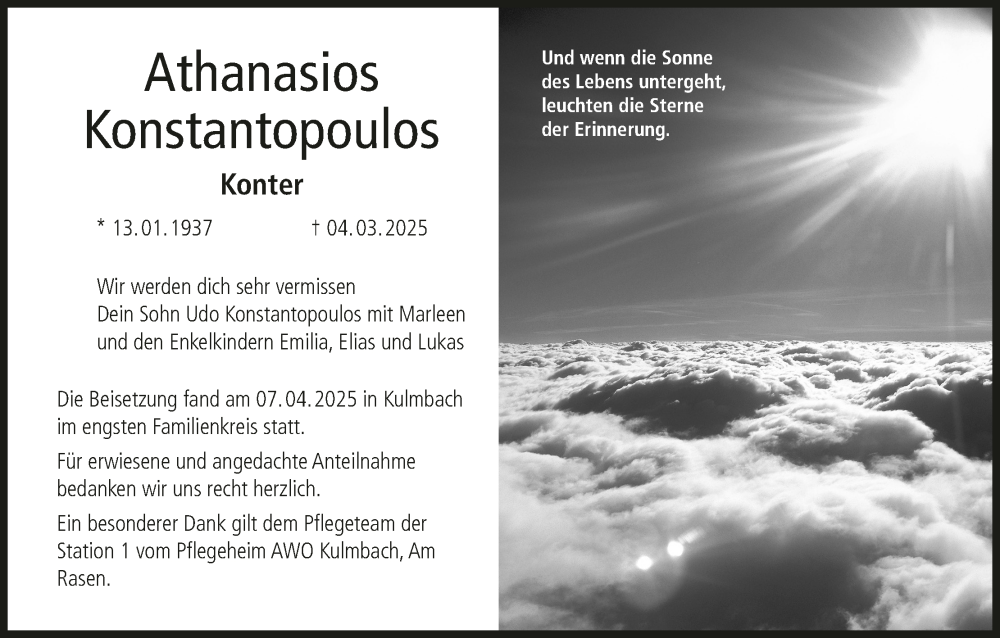 Hier finden Sie alle Traueranzeigen aus der Zeitung, die bisher für Athanasios Konstantopoulos erschienen sind. Weitere Traueranzeigen, die in der Zeitung erscheinen, werden hier ebenfalls aufgelistet