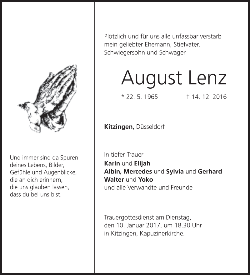 Hier finden Sie alle Traueranzeigen aus der Zeitung, die bisher für August Lenz erschienen sind. Weitere Traueranzeigen, die in der Zeitung erscheinen, werden hier ebenfalls aufgelistet