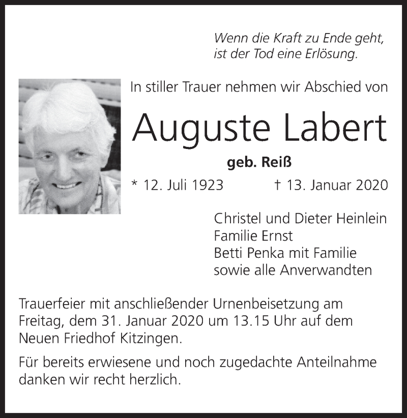 Hier finden Sie alle Traueranzeigen aus der Zeitung, die bisher für Auguste Labert erschienen sind. Weitere Traueranzeigen, die in der Zeitung erscheinen, werden hier ebenfalls aufgelistet