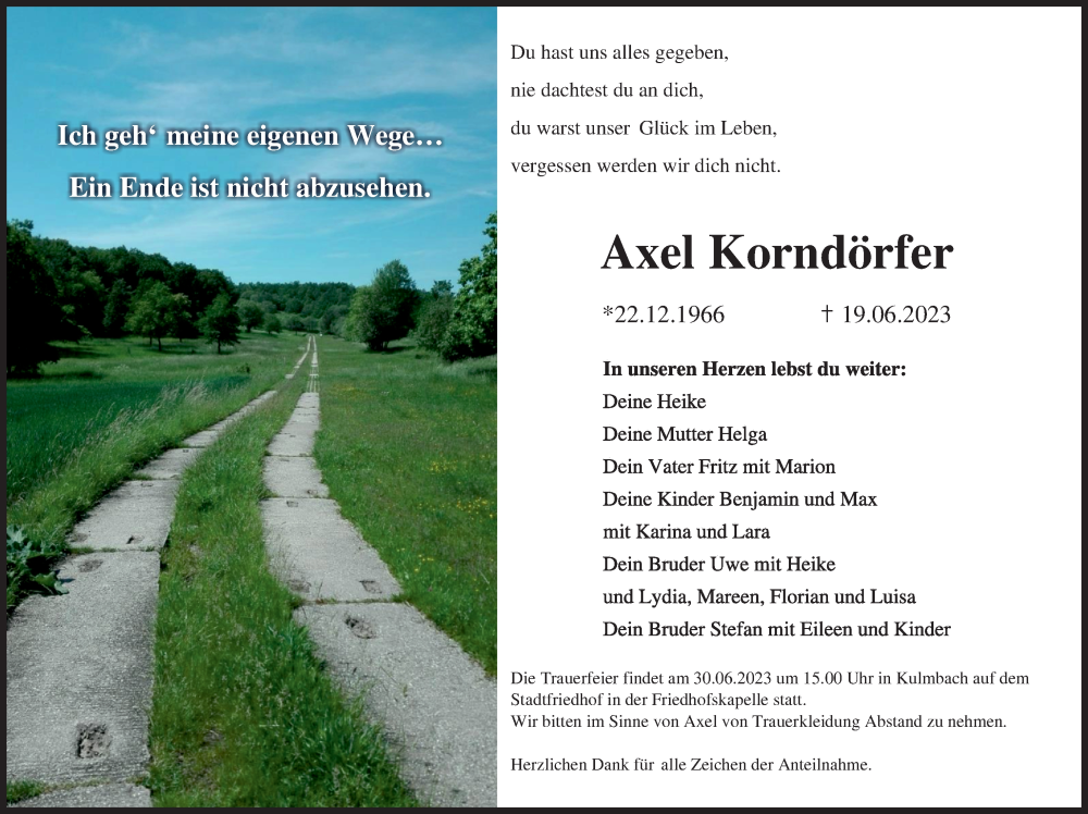 Hier finden Sie alle Traueranzeigen aus der Zeitung, die bisher für Axel Korndörfer erschienen sind. Weitere Traueranzeigen, die in der Zeitung erscheinen, werden hier ebenfalls aufgelistet