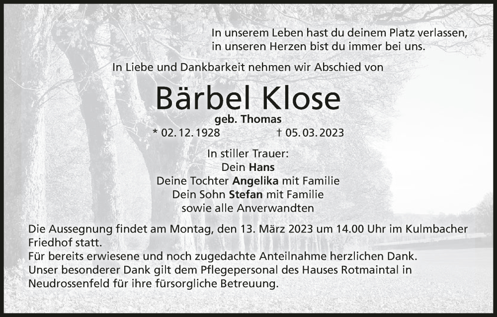 Hier finden Sie alle Traueranzeigen aus der Zeitung, die bisher für Bärbel Klose erschienen sind. Weitere Traueranzeigen, die in der Zeitung erscheinen, werden hier ebenfalls aufgelistet