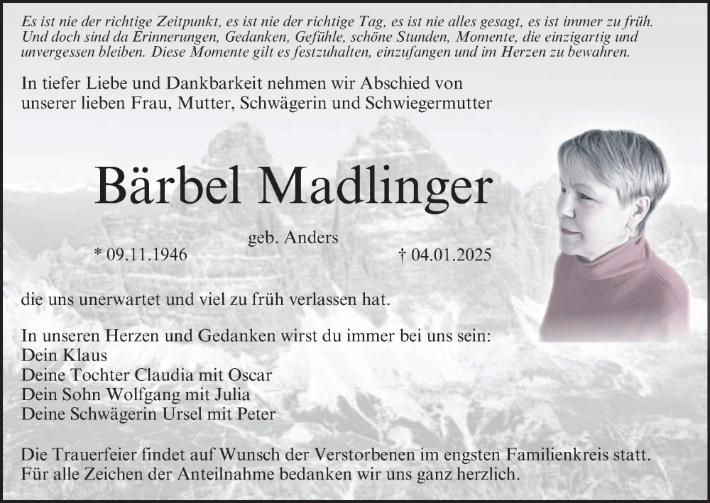 Hier finden Sie alle Traueranzeigen aus der Zeitung, die bisher für Bärbel Madlinger erschienen sind. Weitere Traueranzeigen, die in der Zeitung erscheinen, werden hier ebenfalls aufgelistet