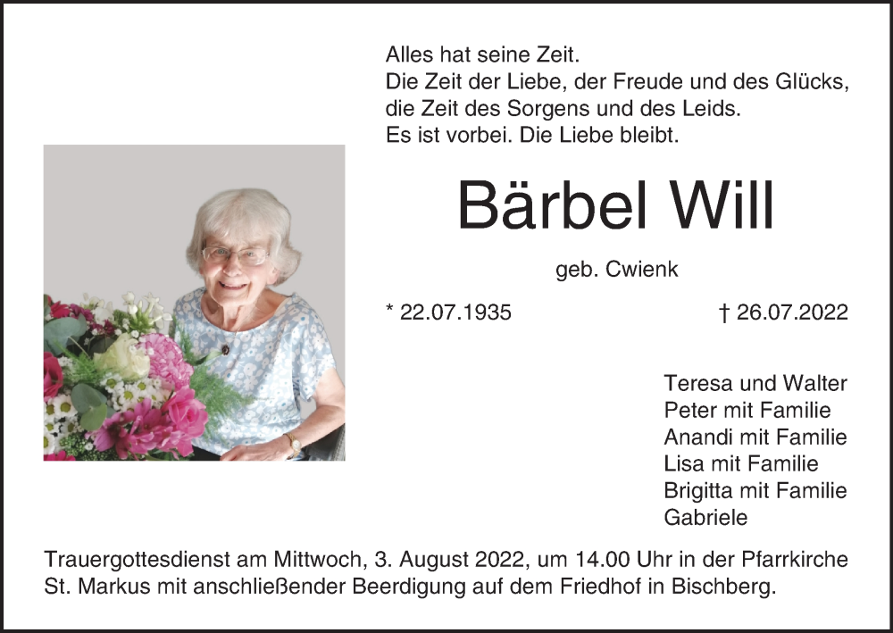 Hier finden Sie alle Traueranzeigen aus der Zeitung, die bisher für Bärbel Will erschienen sind. Weitere Traueranzeigen, die in der Zeitung erscheinen, werden hier ebenfalls aufgelistet
