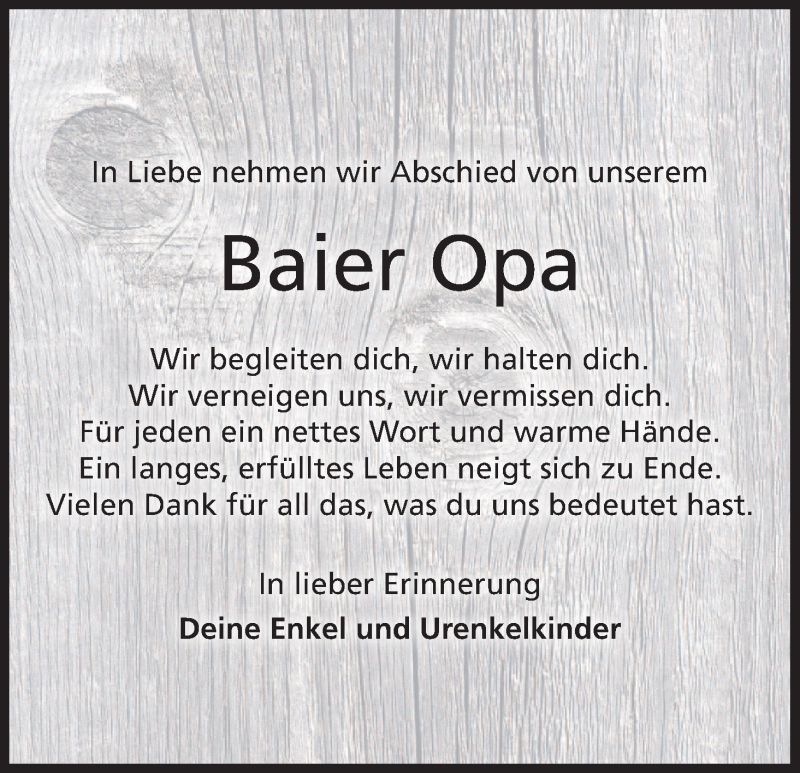 Hier finden Sie alle Traueranzeigen aus der Zeitung, die bisher für Baier Opa erschienen sind. Weitere Traueranzeigen, die in der Zeitung erscheinen, werden hier ebenfalls aufgelistet