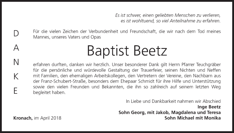 Hier finden Sie alle Traueranzeigen aus der Zeitung, die bisher für Baptist Beetz erschienen sind. Weitere Traueranzeigen, die in der Zeitung erscheinen, werden hier ebenfalls aufgelistet