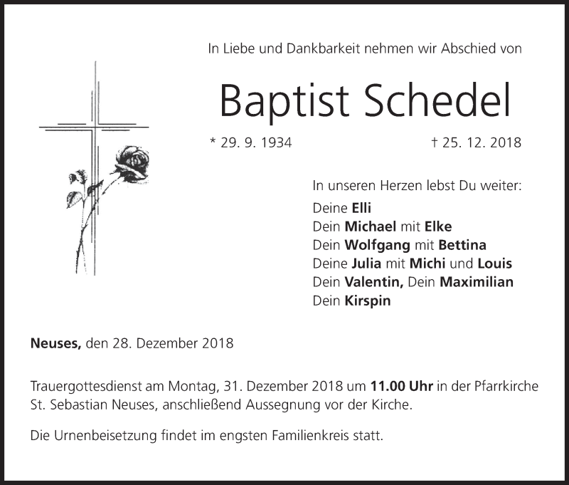 Hier finden Sie alle Traueranzeigen aus der Zeitung, die bisher für Baptist Schedel erschienen sind. Weitere Traueranzeigen, die in der Zeitung erscheinen, werden hier ebenfalls aufgelistet