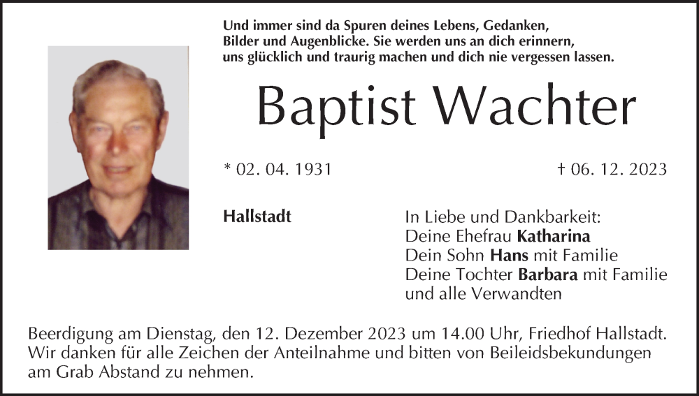 Hier finden Sie alle Traueranzeigen aus der Zeitung, die bisher für Baptist Wachter erschienen sind. Weitere Traueranzeigen, die in der Zeitung erscheinen, werden hier ebenfalls aufgelistet
