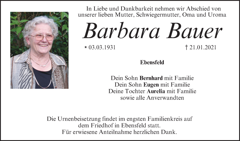 Hier finden Sie alle Traueranzeigen aus der Zeitung, die bisher für Barbara Bauer erschienen sind. Weitere Traueranzeigen, die in der Zeitung erscheinen, werden hier ebenfalls aufgelistet