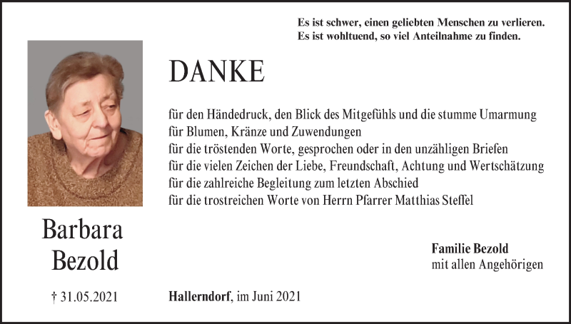 Hier finden Sie alle Traueranzeigen aus der Zeitung, die bisher für Barbara Bezold erschienen sind. Weitere Traueranzeigen, die in der Zeitung erscheinen, werden hier ebenfalls aufgelistet