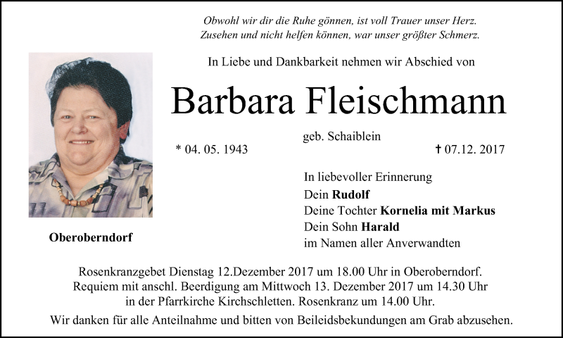 Hier finden Sie alle Traueranzeigen aus der Zeitung, die bisher für Barbara Fleischmann erschienen sind. Weitere Traueranzeigen, die in der Zeitung erscheinen, werden hier ebenfalls aufgelistet