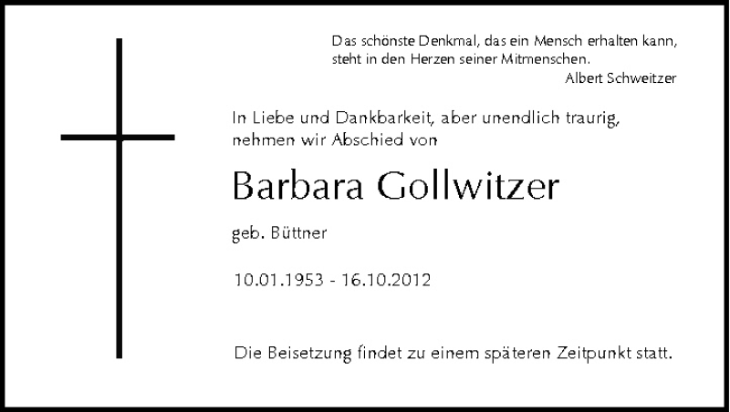 Hier finden Sie alle Traueranzeigen aus der Zeitung, die bisher für Barbara Gollwitzer erschienen sind. Weitere Traueranzeigen, die in der Zeitung erscheinen, werden hier ebenfalls aufgelistet