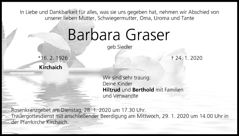 Hier finden Sie alle Traueranzeigen aus der Zeitung, die bisher für Barbara Graser erschienen sind. Weitere Traueranzeigen, die in der Zeitung erscheinen, werden hier ebenfalls aufgelistet