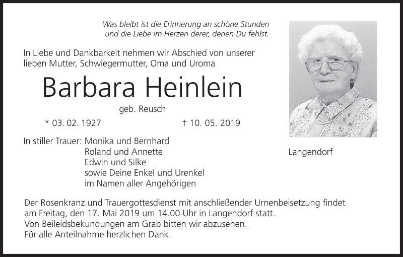 Hier finden Sie alle Traueranzeigen aus der Zeitung, die bisher für Barbara Heinlein erschienen sind. Weitere Traueranzeigen, die in der Zeitung erscheinen, werden hier ebenfalls aufgelistet