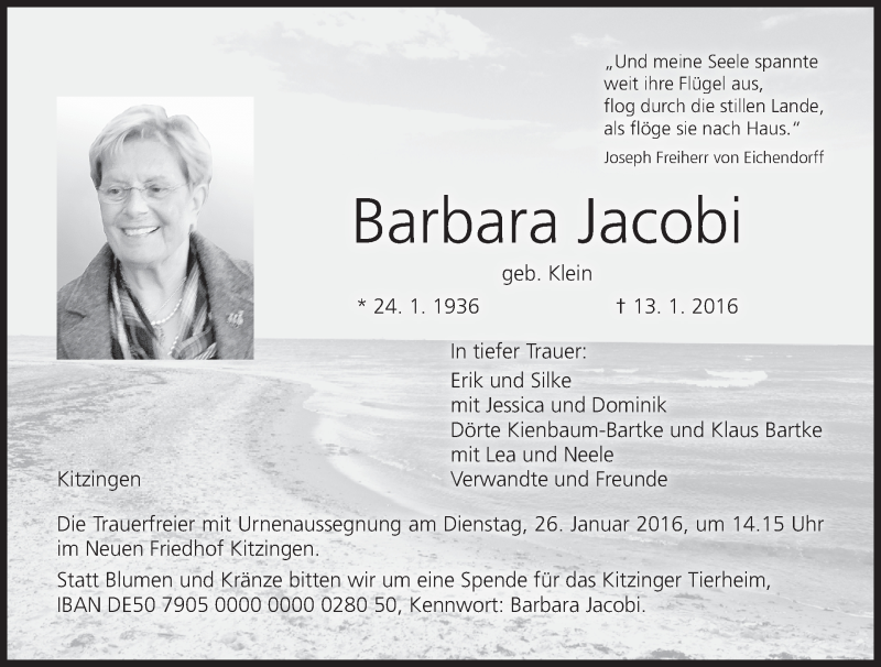 Hier finden Sie alle Traueranzeigen aus der Zeitung, die bisher für Barbara Jacobi erschienen sind. Weitere Traueranzeigen, die in der Zeitung erscheinen, werden hier ebenfalls aufgelistet