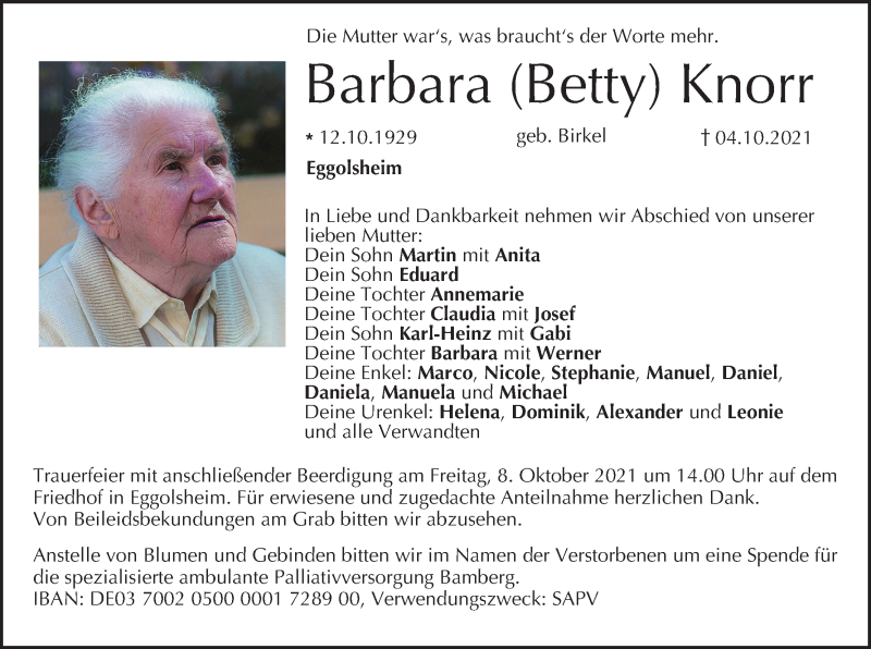 Hier finden Sie alle Traueranzeigen aus der Zeitung, die bisher für Barbara Knorr erschienen sind. Weitere Traueranzeigen, die in der Zeitung erscheinen, werden hier ebenfalls aufgelistet