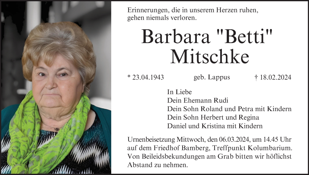 Hier finden Sie alle Traueranzeigen aus der Zeitung, die bisher für Barbara Mitschke erschienen sind. Weitere Traueranzeigen, die in der Zeitung erscheinen, werden hier ebenfalls aufgelistet