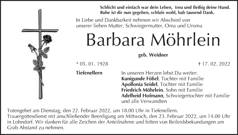 Hier finden Sie alle Traueranzeigen aus der Zeitung, die bisher für Barbara Möhrlein erschienen sind. Weitere Traueranzeigen, die in der Zeitung erscheinen, werden hier ebenfalls aufgelistet