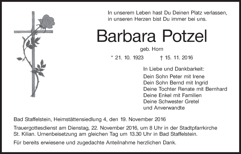 Hier finden Sie alle Traueranzeigen aus der Zeitung, die bisher für Barbara Potzel erschienen sind. Weitere Traueranzeigen, die in der Zeitung erscheinen, werden hier ebenfalls aufgelistet
