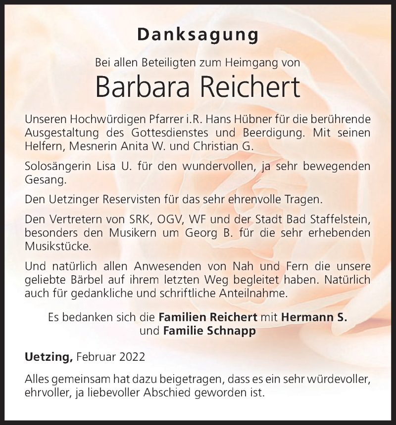 Hier finden Sie alle Traueranzeigen aus der Zeitung, die bisher für Barbara Reichert erschienen sind. Weitere Traueranzeigen, die in der Zeitung erscheinen, werden hier ebenfalls aufgelistet
