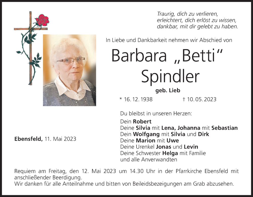 Hier finden Sie alle Traueranzeigen aus der Zeitung, die bisher für Barbara Spindler erschienen sind. Weitere Traueranzeigen, die in der Zeitung erscheinen, werden hier ebenfalls aufgelistet