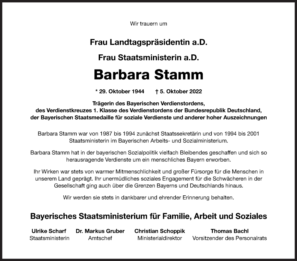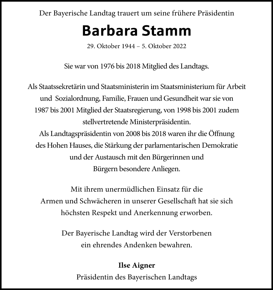 Hier finden Sie alle Traueranzeigen aus der Zeitung, die bisher für Barbara Stamm erschienen sind. Weitere Traueranzeigen, die in der Zeitung erscheinen, werden hier ebenfalls aufgelistet