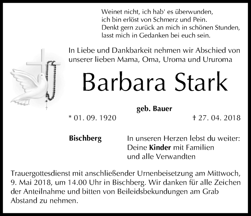 Hier finden Sie alle Traueranzeigen aus der Zeitung, die bisher für Barbara Stark erschienen sind. Weitere Traueranzeigen, die in der Zeitung erscheinen, werden hier ebenfalls aufgelistet