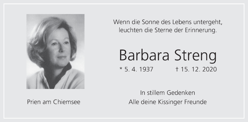 Hier finden Sie alle Traueranzeigen aus der Zeitung, die bisher für Barbara Streng erschienen sind. Weitere Traueranzeigen, die in der Zeitung erscheinen, werden hier ebenfalls aufgelistet