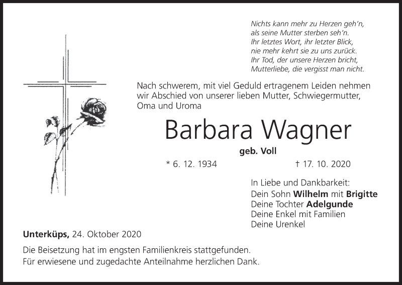 Hier finden Sie alle Traueranzeigen aus der Zeitung, die bisher für Barbara Wagner erschienen sind. Weitere Traueranzeigen, die in der Zeitung erscheinen, werden hier ebenfalls aufgelistet