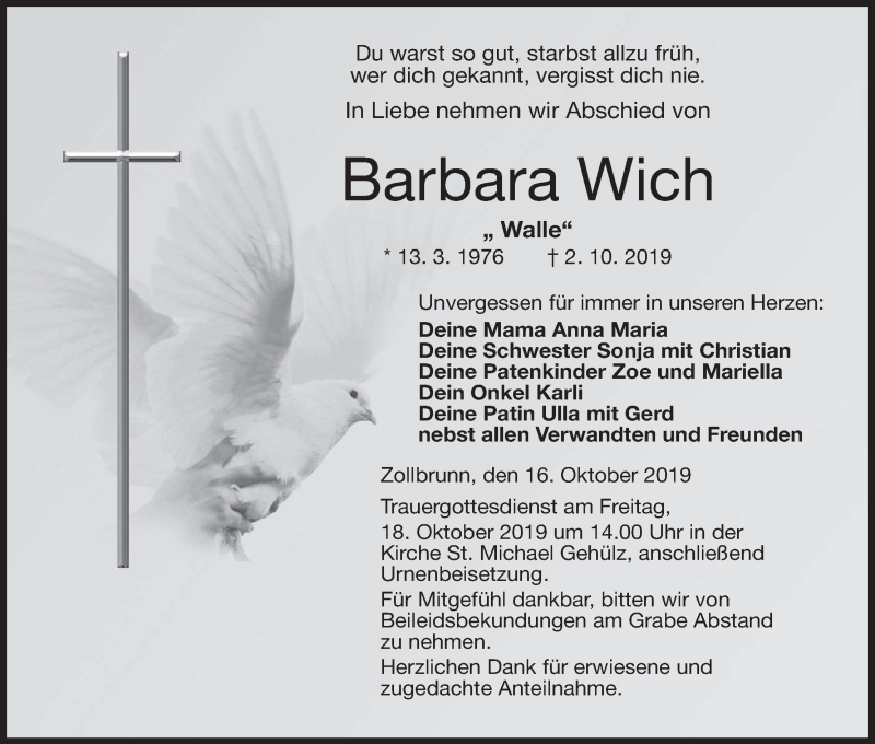 Hier finden Sie alle Traueranzeigen aus der Zeitung, die bisher für Barbara Wich erschienen sind. Weitere Traueranzeigen, die in der Zeitung erscheinen, werden hier ebenfalls aufgelistet