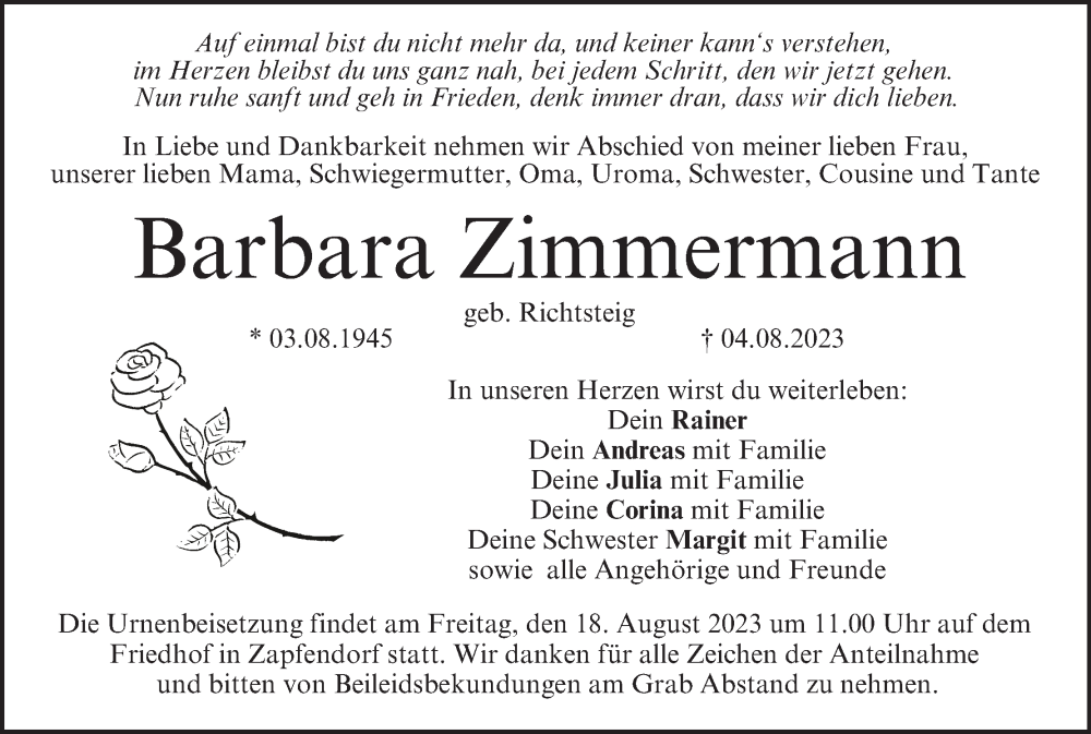 Hier finden Sie alle Traueranzeigen aus der Zeitung, die bisher für Barbara Zimmermann erschienen sind. Weitere Traueranzeigen, die in der Zeitung erscheinen, werden hier ebenfalls aufgelistet