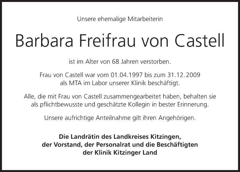Hier finden Sie alle Traueranzeigen aus der Zeitung, die bisher für Barbara Freifrau von Castell erschienen sind. Weitere Traueranzeigen, die in der Zeitung erscheinen, werden hier ebenfalls aufgelistet