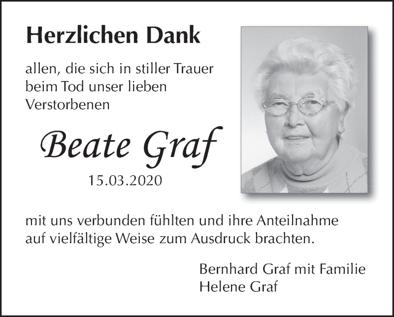 Hier finden Sie alle Traueranzeigen aus der Zeitung, die bisher für Beate Graf erschienen sind. Weitere Traueranzeigen, die in der Zeitung erscheinen, werden hier ebenfalls aufgelistet