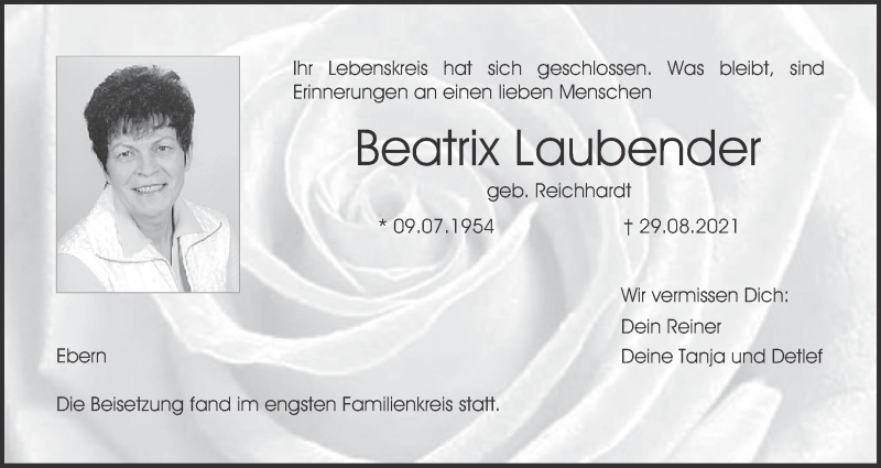 Hier finden Sie alle Traueranzeigen aus der Zeitung, die bisher für Beatrix Laubender erschienen sind. Weitere Traueranzeigen, die in der Zeitung erscheinen, werden hier ebenfalls aufgelistet