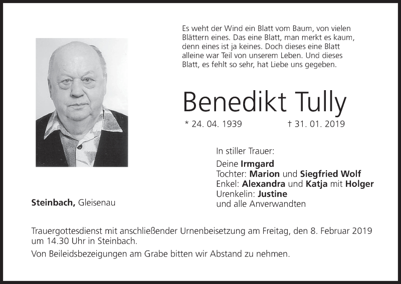 Hier finden Sie alle Traueranzeigen aus der Zeitung, die bisher für Benedikt Tully erschienen sind. Weitere Traueranzeigen, die in der Zeitung erscheinen, werden hier ebenfalls aufgelistet