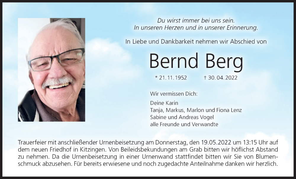 Hier finden Sie alle Traueranzeigen aus der Zeitung, die bisher für Bernd Berg erschienen sind. Weitere Traueranzeigen, die in der Zeitung erscheinen, werden hier ebenfalls aufgelistet