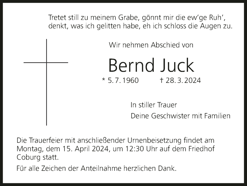 Hier finden Sie alle Traueranzeigen aus der Zeitung, die bisher für Bernd Juck erschienen sind. Weitere Traueranzeigen, die in der Zeitung erscheinen, werden hier ebenfalls aufgelistet