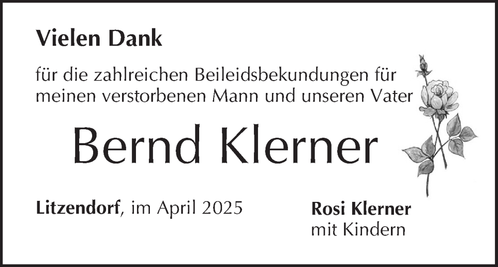 Hier finden Sie alle Traueranzeigen aus der Zeitung, die bisher für Bernd Klerner erschienen sind. Weitere Traueranzeigen, die in der Zeitung erscheinen, werden hier ebenfalls aufgelistet