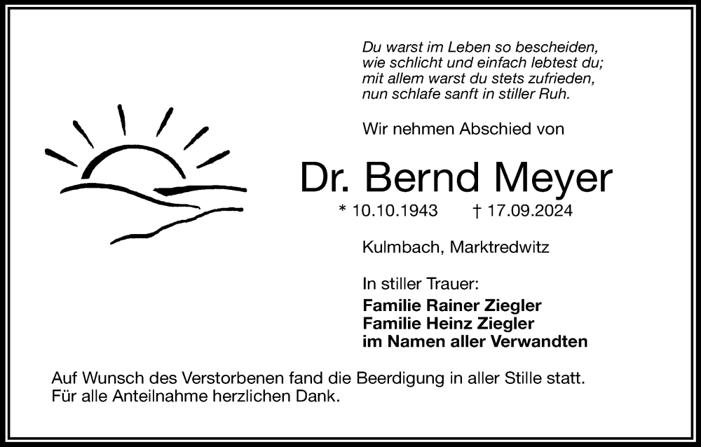 Hier finden Sie alle Traueranzeigen aus der Zeitung, die bisher für Bernd Meyer erschienen sind. Weitere Traueranzeigen, die in der Zeitung erscheinen, werden hier ebenfalls aufgelistet