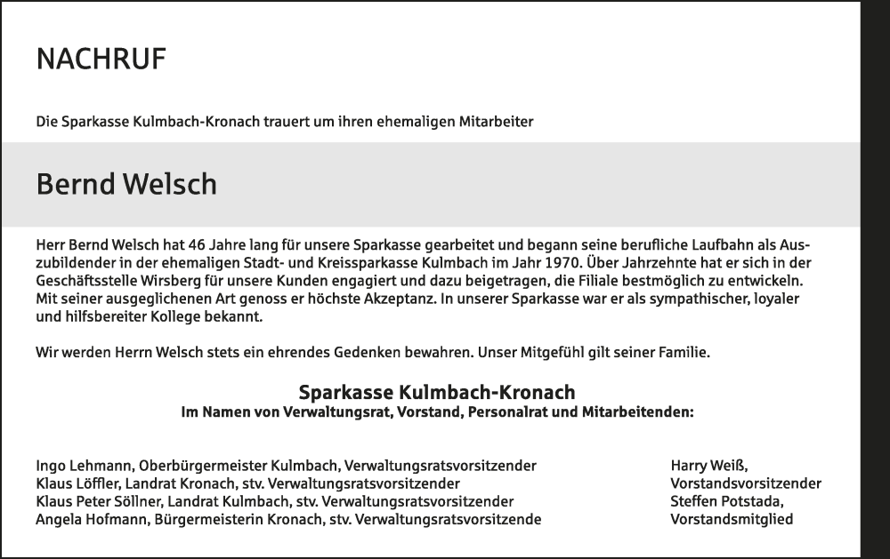 Hier finden Sie alle Traueranzeigen aus der Zeitung, die bisher für Bernd Welsch erschienen sind. Weitere Traueranzeigen, die in der Zeitung erscheinen, werden hier ebenfalls aufgelistet
