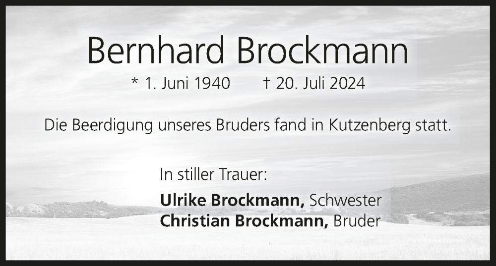 Hier finden Sie alle Traueranzeigen aus der Zeitung, die bisher für Bernhard Brockmann erschienen sind. Weitere Traueranzeigen, die in der Zeitung erscheinen, werden hier ebenfalls aufgelistet
